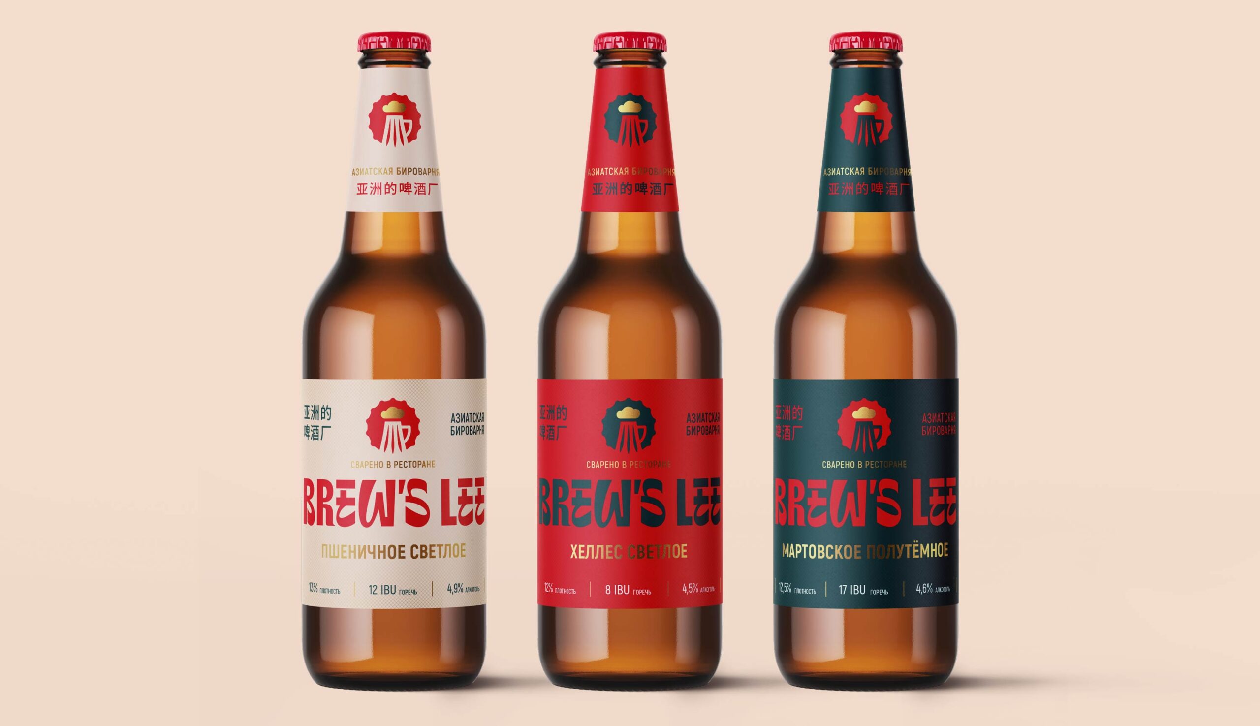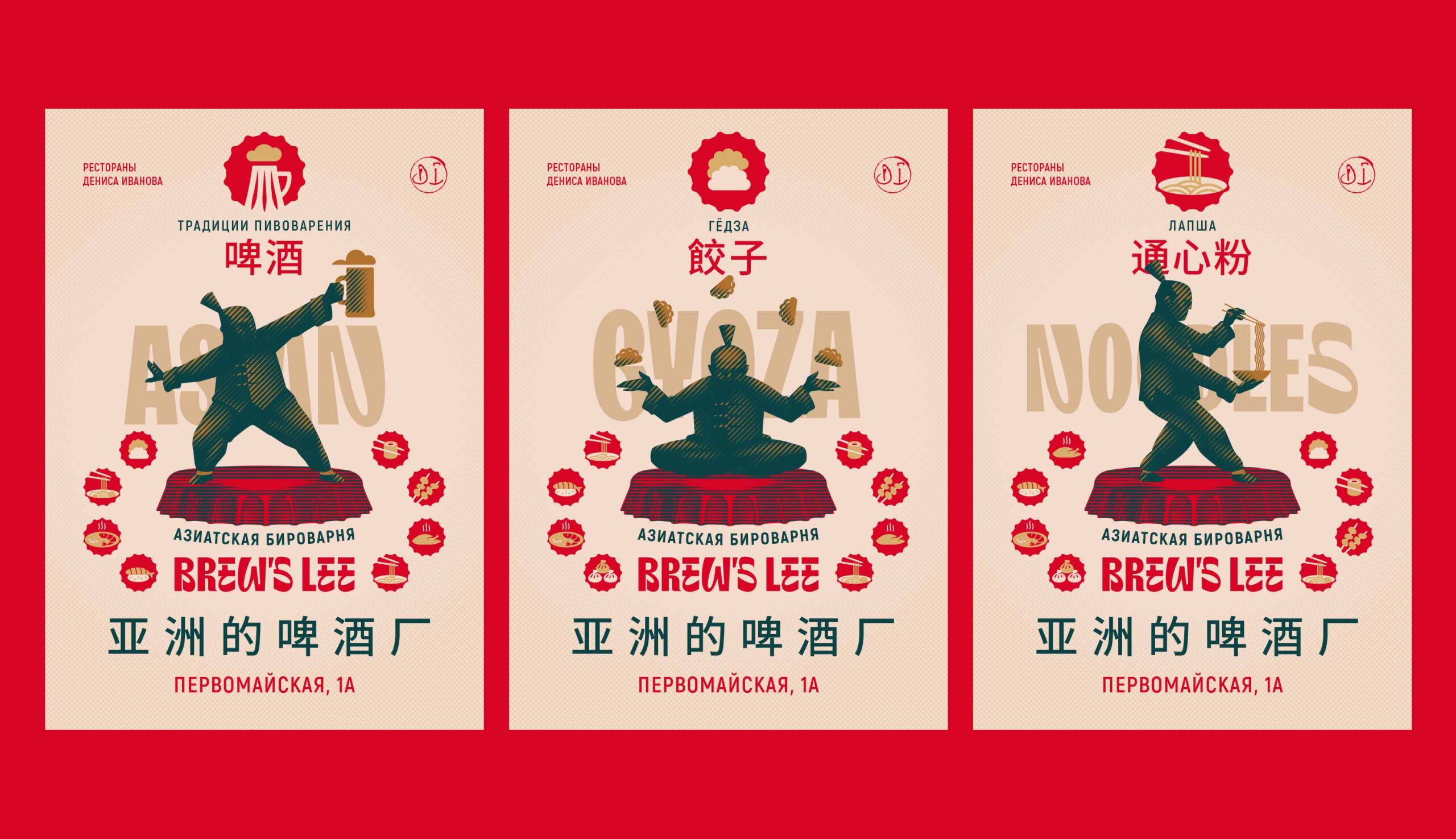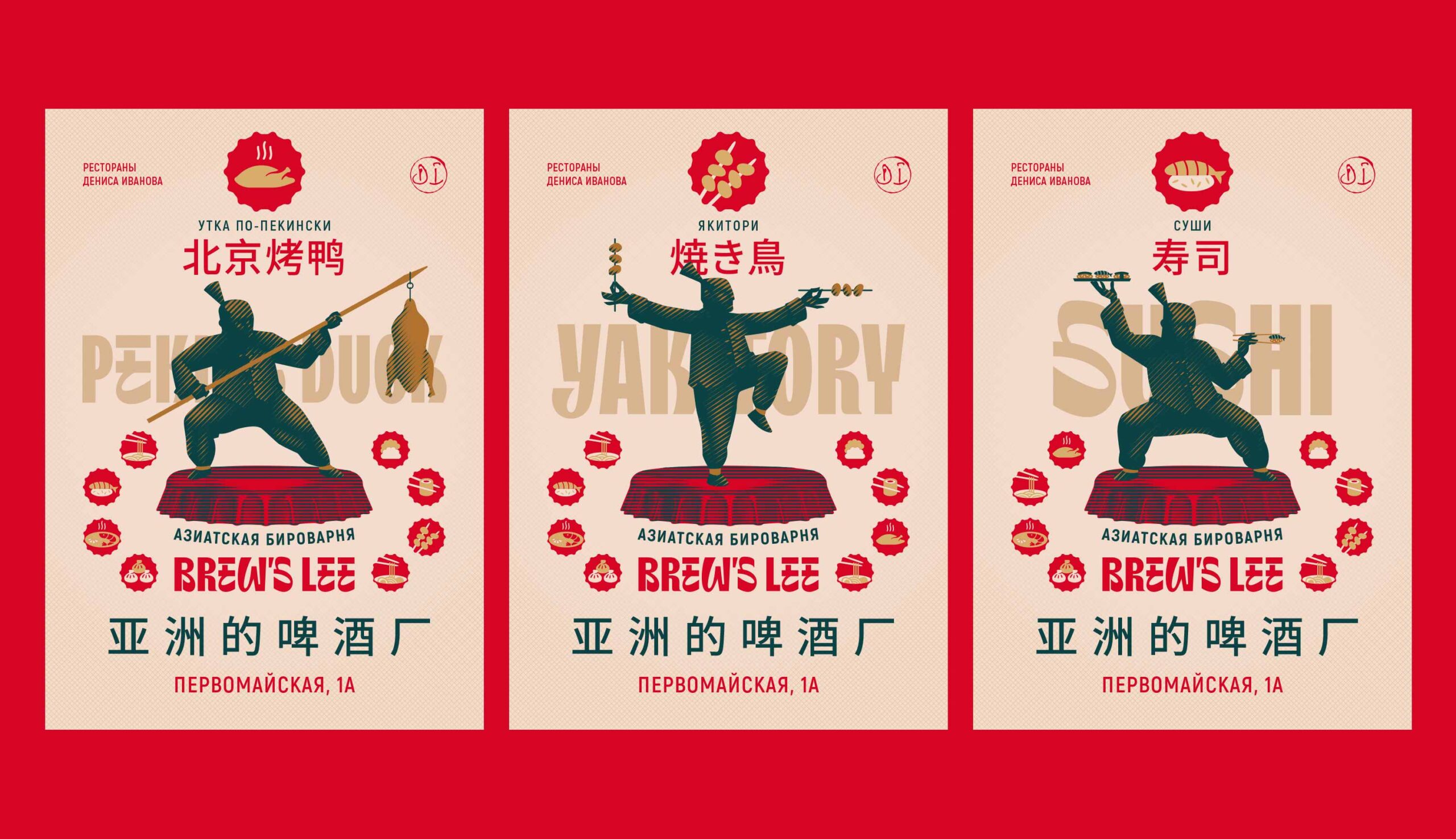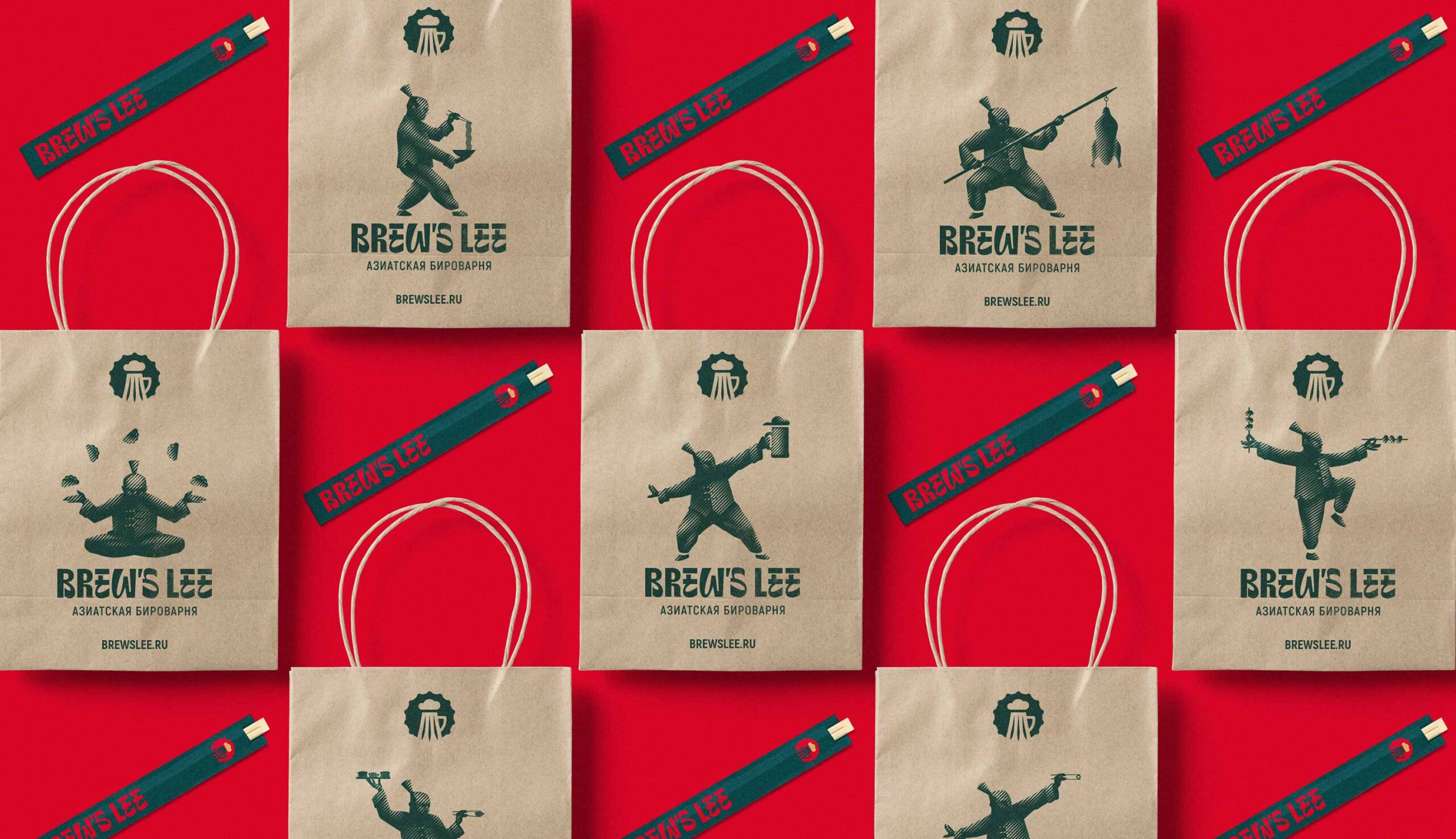 Айдентика строится на сочетании пивной тематики и азиатской визуальной культуры с узнаваемым характером и живым настроением. Название Brew„s Lee придумал клиент. Нас зацепила игра слов — оно отсылает к Брюсу Ли, но «наш Ли» стал другим персонажем: мастером пивоварения с Востока.