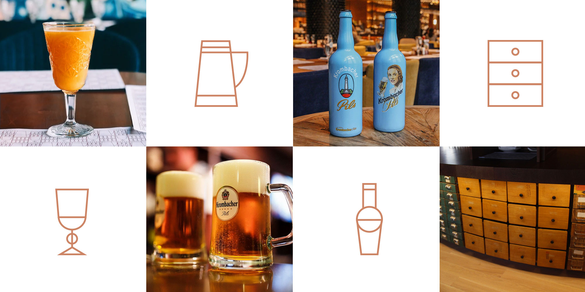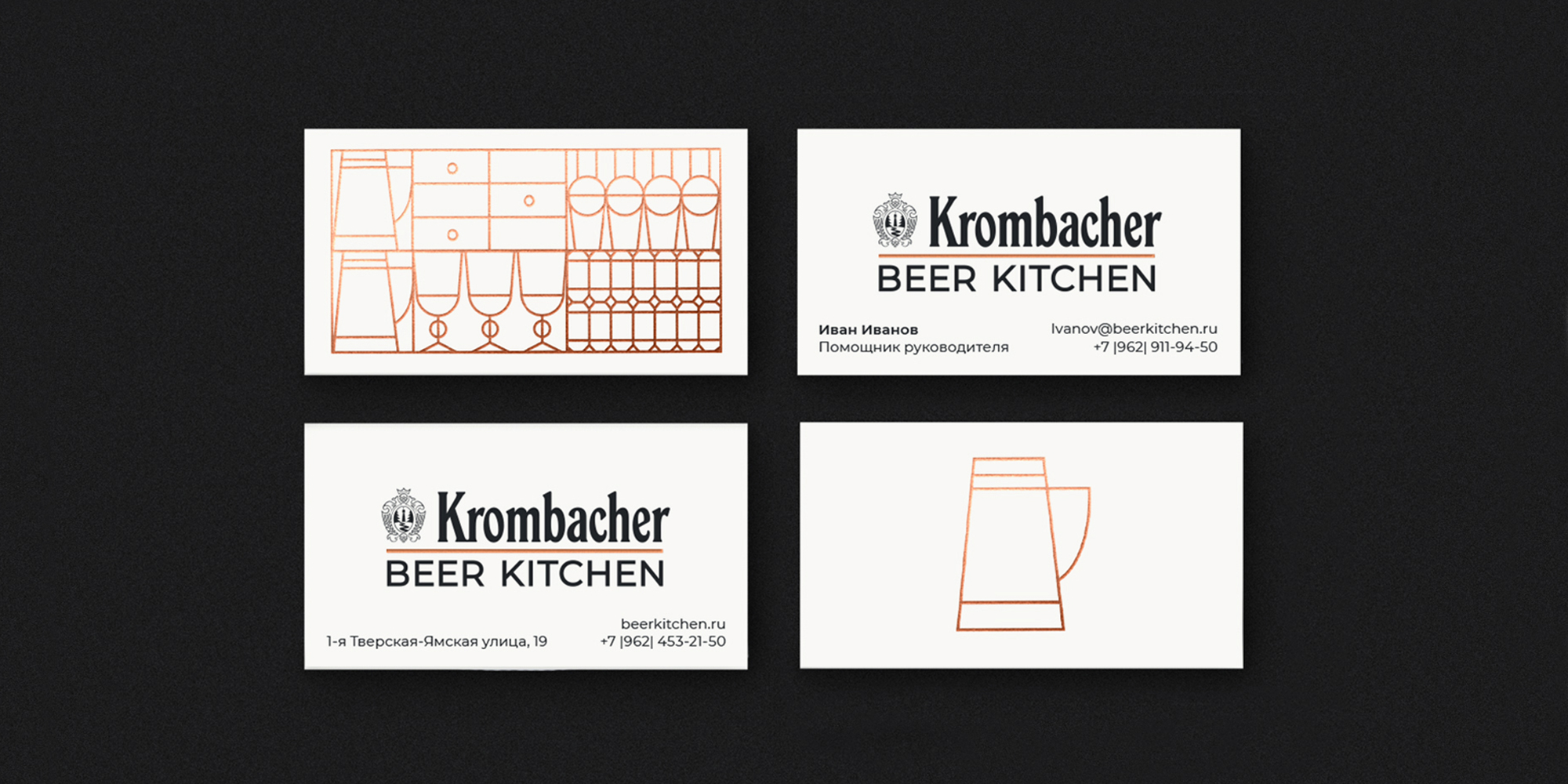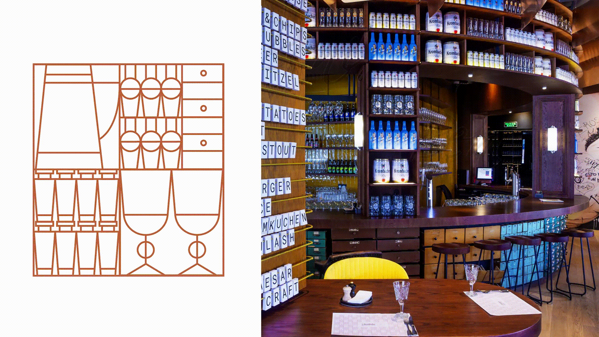 Элементы паттерна – стилизованные формы подачи разных сортов пива, многообразием которых гордится ресторан. Строгий стиль в оттенках черного и бронзы поддерживает атмосферу высокой кухни.
