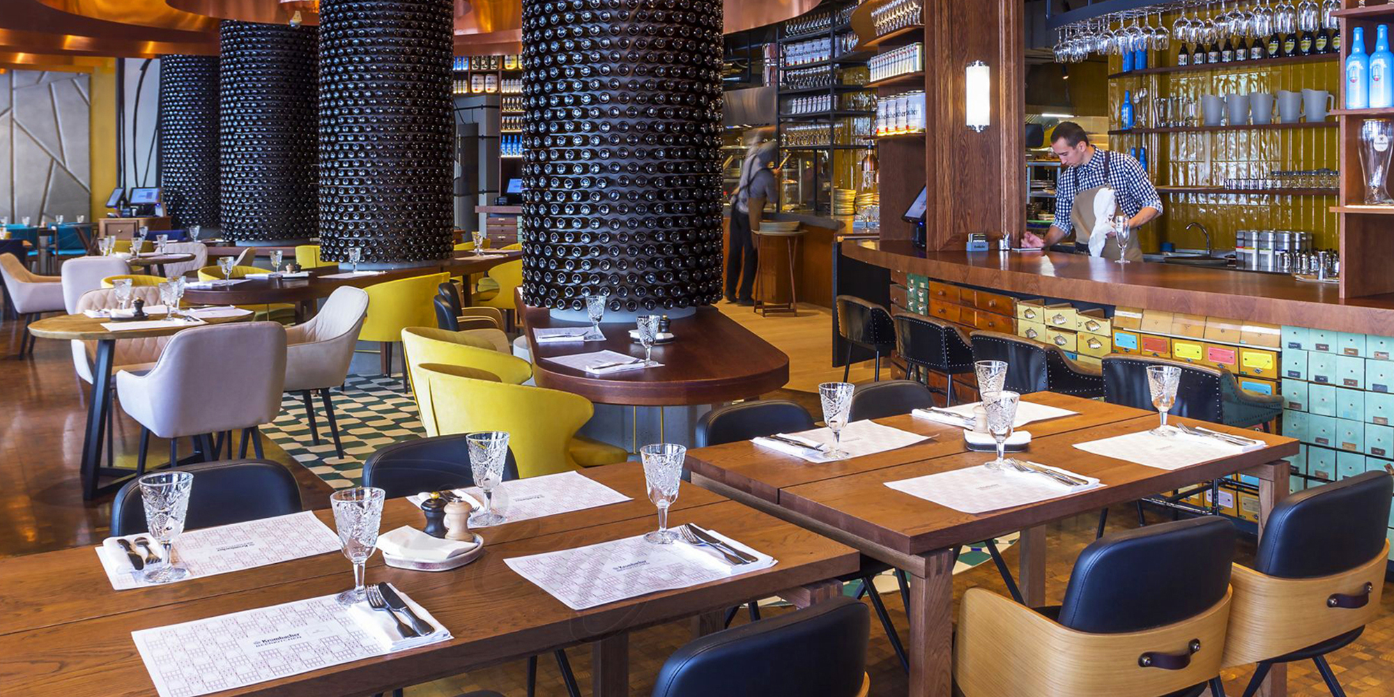 Ищем опору в интерьере – и находим ее в фирменных для Иванова высоких колоннах. Они превращаются в генерируемые паттерны, объединяющие блюда и напитки разных культур под одной крышей.